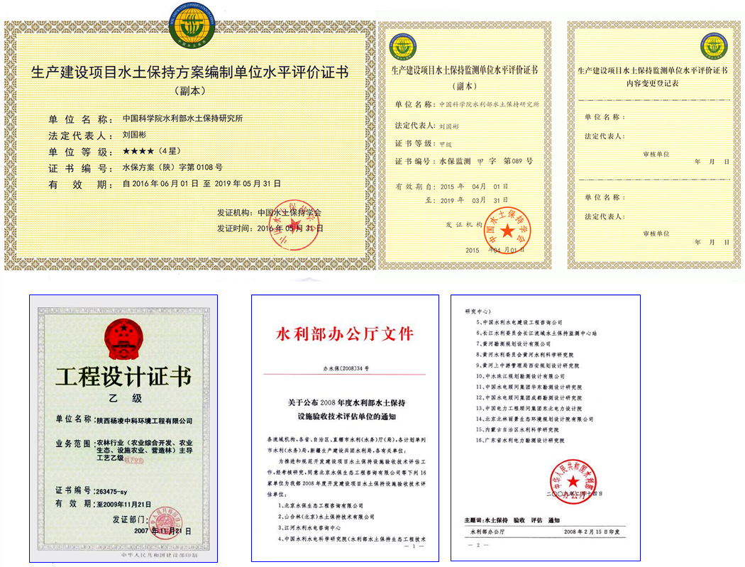 我中心具有开发建设项目水土保持方案编制单位水平评价证书(4星)、生产建设项目水土保持监测单位水平评价证书、乙级工程设计证书等相关水土保持相关资质。